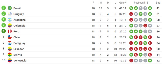 Brazil je završio na vrhu grupe s 41 bodom, Urugvaj je drugi s 31, Argentina treća s 28 bodova, a posljednje mjesto koje vodi na Svjetsko prvenstvo zauzela je Kolumbija remijem 1:1 u Peruu, koji je izborio baraž.