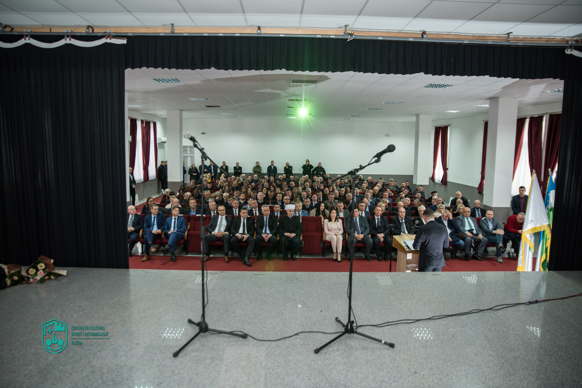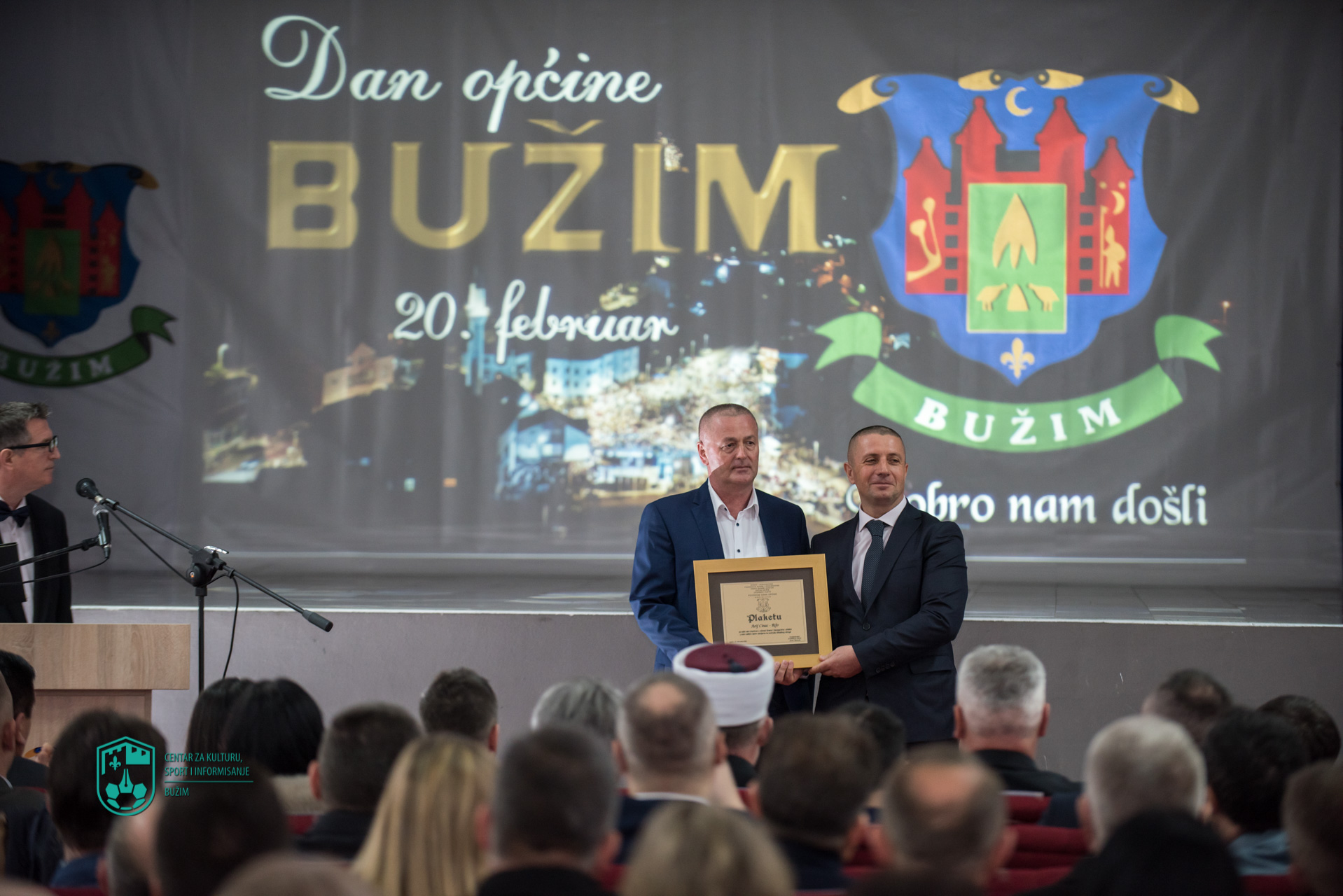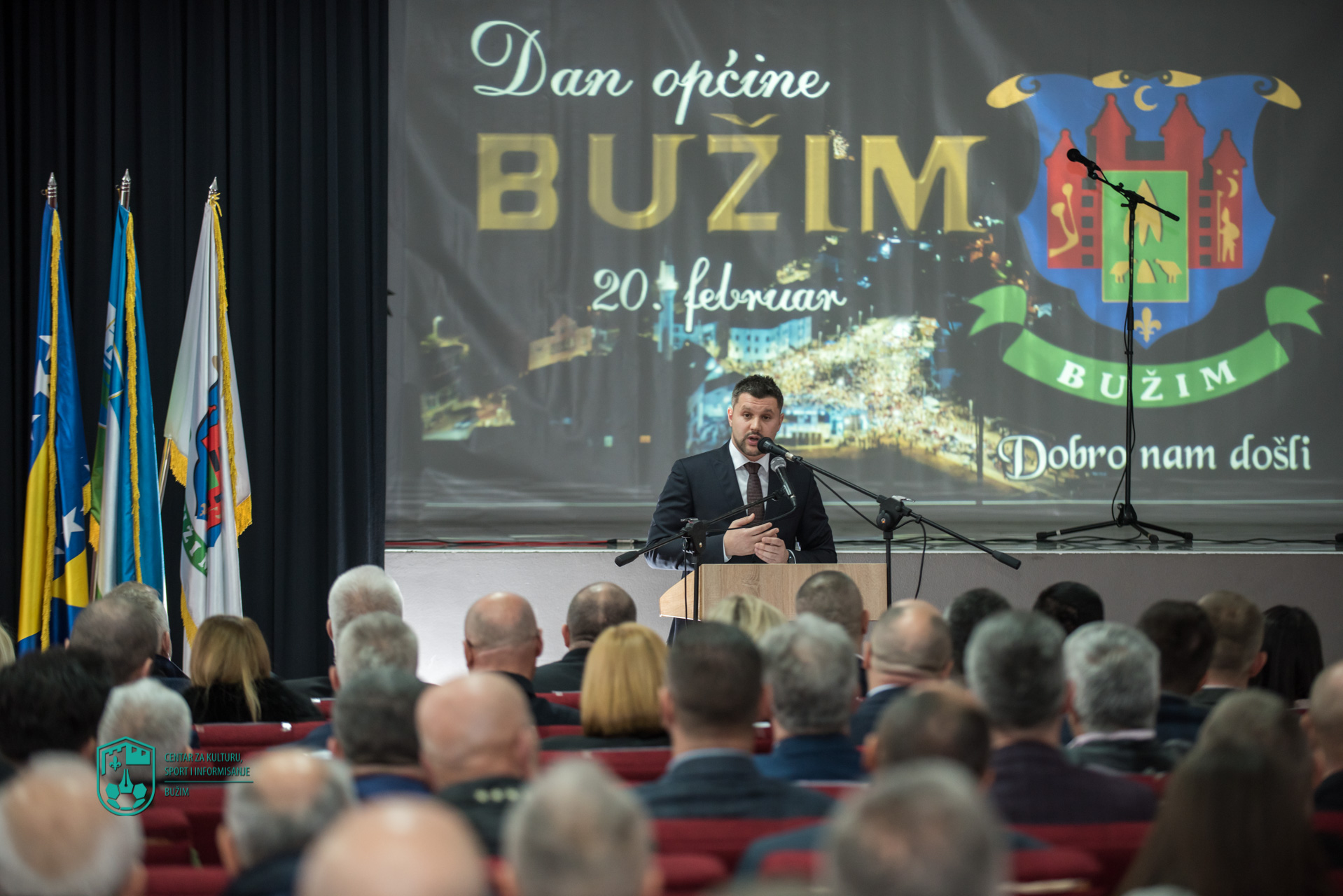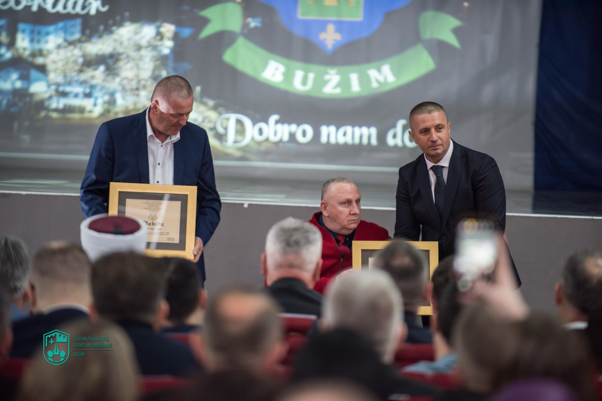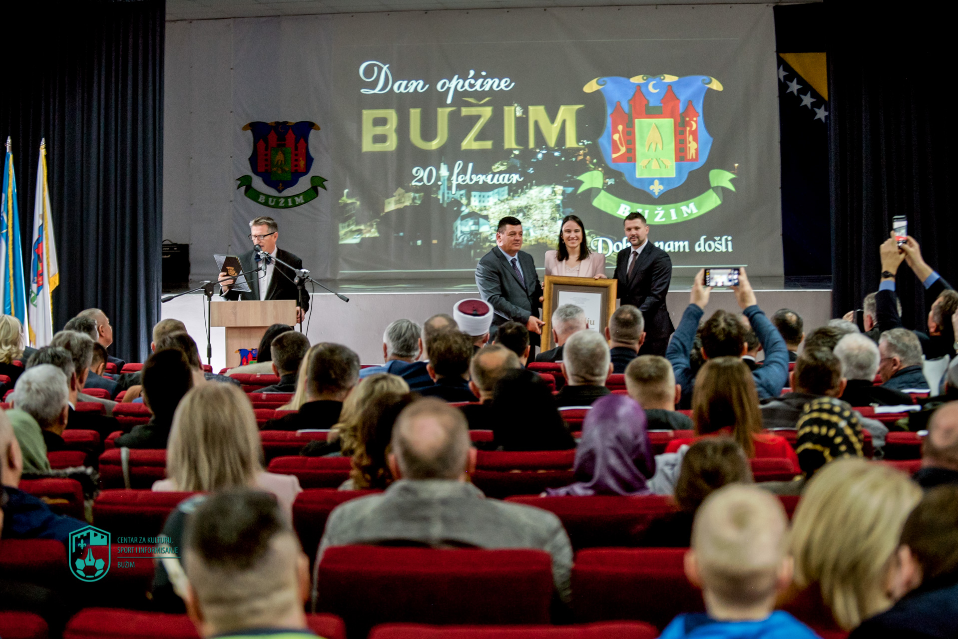 Danas je nizom događaja u Bužimu svečano obilježen Dan Općine Bužim. Bužim je kroz historiju dva puta gubio, a tri puta vraćao svoj status, koji mu je kao općini posljednji put vraćen 1995. godine, odlukom Ratnog predsjedništva BiH. Tim povodom upriličena je Svečana sjednica i Svečana akademija koja je, pored domaćina, okupila veliki broj uzvanica sa federalnog, kantonalnog i lokalnog nivoa. Nakon intoniranja himne, prisutnima se obratio predsjedavajući Općinskog vijeća općine Bužim Suvad Šahinović te čestitao svim građankama i građanima rođendan općine Bužim, posebno naglasivši dobrodošlicu svim gostima uz nadu da su stekli pravi dojam o Bužimljanima, kao iskrenim, čestitim i hrabrim ljudima koji vole svoju domovinu i koji su za suživot i toleranciju, a ne kako ih se posljednjih nekoliko mjeseci predstavlja. Nakon njega skupu se obratio Mersudin Nanić, načelnik općine Bužim, takođe čestitavši 27. rođendan općine Bužim. Između ostalog zahvalio se svima koji pomažu općini Bužim, te se osvrnuo posebno na infrastrukturne projekte u protekloj godini te naglasio da je u Bužim uloženo preko 5 miliona KM što Bužim čini i činiće sredinu za lakši i bolji život mještana. Takav trend najavio je i u 2022. godini. Prisutnima su se obratili i čestitke uputili i Premijer USK Mustafa Ružnić, kao i Ministar Poljoprivrede vodoprivrede i šumarstva FBiH u ime premijera FBiH Fadila Novalića Šemsudin Dedić, a nakon njih i muftija bihaćki hafiz Mehmed ef. Kudić. Nakon pauze i nastupa članica Ženskog gradskog hora Bužim, uslijedila je dodjela najviših općinskih priznanja. Povelja Općine Bužim za 2022. godinu dodijeljena je OZZ «Trgozad, dok je počasnim građaninom općine Bužim ove godine proglašena Benjamina Karić Londrc, gradonačelnica grada Sarajevo, koja je u svom obraćanju obećala svesrdnu saradnju i pomoć Grada Sarajevo općini Bužim u infrastrukturi, školstvu i kulturi. Povelje su zajedno uručili načelnik općine Bužim Mersudin Nanić i predsjedavajući Općinskog vijeća Suvad Šahinović. Prije svečane sjednice, Općina Bužim upriličila je prijem za dosadašnje predstavnike izvršne i zakonodavne vlasti na lokalnom nivou, te za brojne uzvanice javnog, društvenog i političkog miljea. Organizovana je i posjeta Turbetu generala Izeta Nanića, gdje je odana počast svim šehidima, a zatim i posjeta Muzej sobi 505. Viteške brigade. Za nesebičan društveni doprinos pojedincima i kolektivima uručene su brojne plakete najistaknutijim građanima, Plakete Općine Bužim dodjeljene su: Arifu Rifi Cincu, Vedadu Deljkoviću, Aliji Durakoviću – Gumenom, Razimu Halkiću i Halidi Emrić, a uručio ih je zamjenik predsjedavajaćeg općinskog vijeća Nermin Porić Nas kraju programa prisutni su imali priliku vidjeti video prezentaciju projekta Muzeja 505. Viteške brigade koji će se graditi na Turbetu Generala Izeta Nanića. Manifestacija Dani općine Bužim nastavlja se i idućih dana te pozivamo sve građane da prate i ostale sadržaje. Više fotografija pogledajte u galeriji ispod: Beitrags-Navigation ČESTITKA POVODOM DANA OPĆINE BUŽIM OPĆINA TRNOVO SUFINASIRA PROJEKAT IZGRADNJE MUZEJ SOBE 505. VITEŠKE BRIGADE